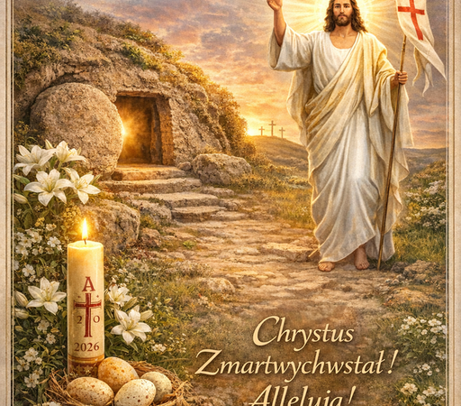 Drodzy Parafianie i Goście, Niech Zmartwychwstały Chrystus, który pokonał grzech i śmierć, obdarza Was swoim pokojem, umacnia wiarę, odnawia nadzieję i rozpala w sercach miłość. Niech światło pustego grobu rozjaśnia wszystkie drogi Waszego życia, szczególnie w chwilach trudnych, pełnych niepewności…