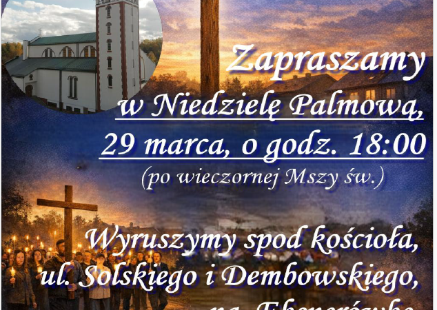Zapraszamy na nabożeństwo Drogi Krzyżowej, które odbędzie się w naszej parafii w Niedzielę Palmową. To wyjątkowy czas refleksji, modlitwy i duchowego przygotowania, w którym razem możemy rozważać mękę Pana Jezusa i umacniać naszą wiarę.