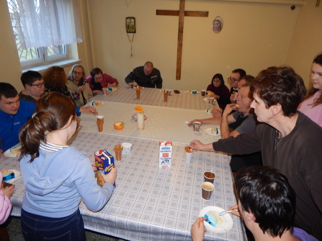Spotkanie zakończyliśmy przy pysznym urodzinowym cieście oraz kawie, spędzając miło czas na rozmowach i wspólnym świętowaniu.