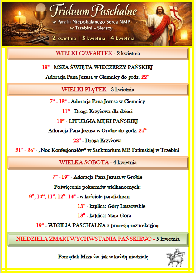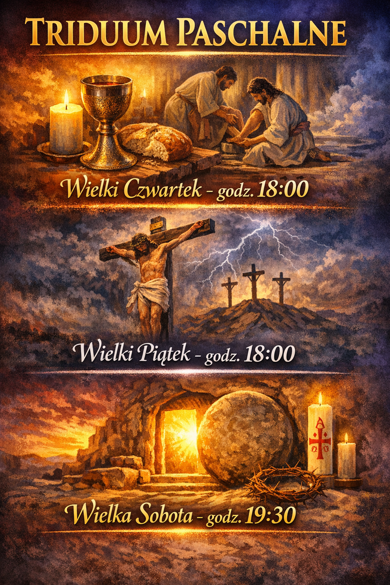 Zapraszamy wszystkich Parafian do wspólnego przeżywania Triduum Paschalnego – najświętszych dni w roku liturgicznym, w których rozważamy mękę, śmierć i zmartwychwstanie Pana Jezusa.